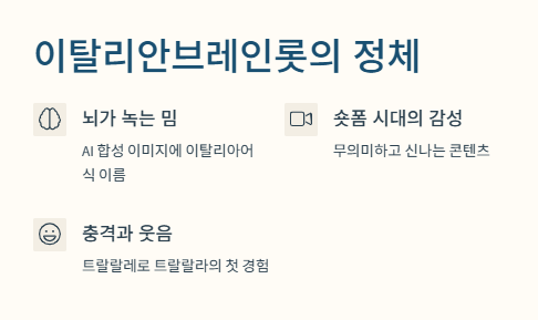 짧고 강렬해서 그냥 휙~ 보고 넘어가기 좋거든요. 요즘 숏폼 시대잖아요? 틱톡, 인스타 릴스, 유튜브 쇼츠 이런 데서 이탈리안브레인롯은 딱이에요.