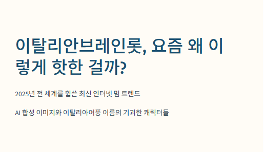 '이탈리안브레인롯'은 2025년 TikTok, 인스타그램 등 숏폼 플랫폼에서 전 세계를 휩쓴 최신 인터넷 밈 트렌드예요. '뇌가 녹는다'는 뜻의 이탈리안브레인롯은 AI 합성 이미지, 이탈리아어풍 이름, 기괴하고 웃긴 캐릭터들이 특징이에요. 특히 10대와 Z세대 사이에서 폭발적으로 인기를 끌면서 다양한 2차 창작물도 생겨났어요. 여기서는 이탈리안브레인롯이 뭔지, 왜 이렇게 뜬 건지, 그리고 직접 본 경험까지 자세히 풀어볼게요!