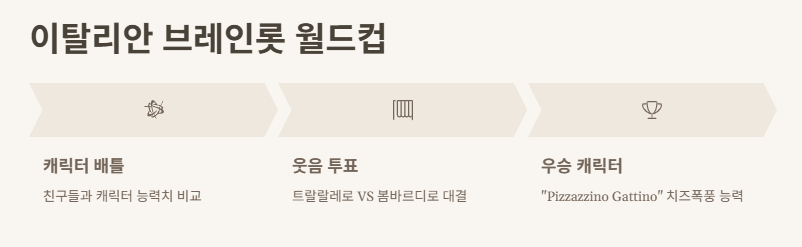 "이탈리안 브레인롯 월드컵"이라면서 친구들이랑 캐릭터끼리 배틀하는 놀이를 해봤거든. 뭐랄까, 캐릭터들 능력치 비교하고 누가 더 웃긴지 투표하고. ‘트랄랄레로 트랄랄라’ VS ‘봄바르디로 크로코딜로’ 대결에서 다들 빵 터졌어. 그 와중에 내가 직접 만든 "Pizzazzino Gattino"라는 캐릭터가 치즈폭풍 능력으로 우승했을 때는 진짜 나까지 뿌듯했다니까!