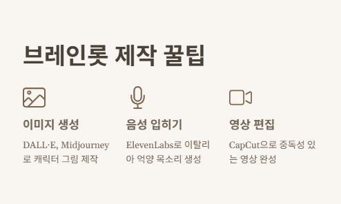 혹시 너도 나처럼 브레인롯 캐릭터 만들어보고 싶어? 그럼 DALL·E나 Midjourney로 그림 만들고, ElevenLabs로 이탈리아 억양 목소리 입히면 돼. 그리고 CapCut으로 영상 편집까지 하면 너도 틱톡 스타 가능! 나도 만들어봤는데, 중독성 쩌는 결과물에 감탄했어.