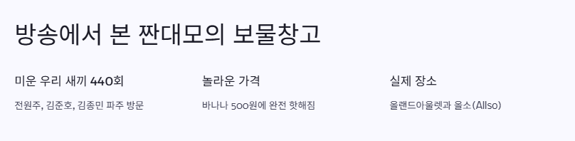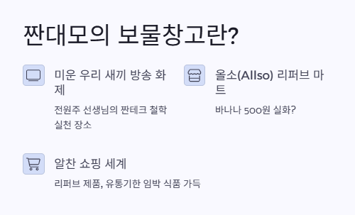 '짠대모의 보물창고'라는 말, 요즘 진짜 많이 들리죠? 특히 ‘미운 우리 새끼’ 440회에서 전원주 선생님이 김준호, 김종민과 함께 파주에 있는 리퍼브 마트를 방문하면서 완전 핫해졌어요. 방송 보면서 “헐, 바나나 500원?”, “진짜 저런 곳이 있단 말이야?” 하고 놀란 분들 많았을 거예요.