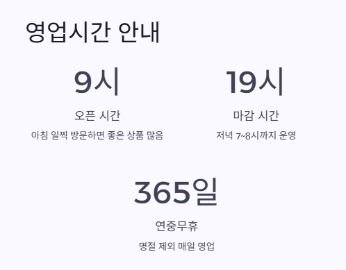 오전 9시부터 저녁 7~8시까지, 명절 제외하고 연중무휴예요.