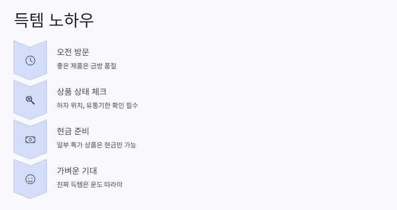 - 가볍게 기대하고 가기! 원하는 물건 없을 수도 있지만, 진짜 득템은 운도 따라야 하니까요.
