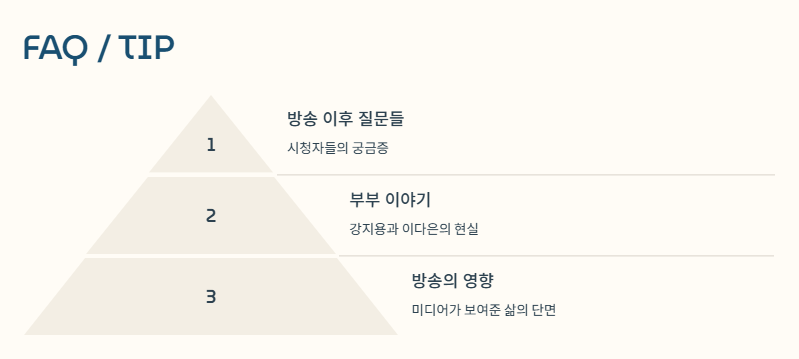 이다은 씨는 진짜 현실 속에서 살아가는 우리 누나 같았어. 결혼하면 로맨틱할 줄 알았는데, 그게 아니고 그냥 현실 그 자체였던 거야. 강지용 씨가 축구 은퇴하고 공장에서 일하면서 벌이는 월 300만 원. 그걸로 가정 꾸리고 애 키우고… 말이 쉽지 진짜 쉽지 않잖아.