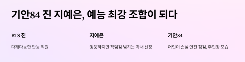 ‘기안84 대환장 기안장’, ‘기안84 진 지예은 케미’는 계속해서 이슈가 되고 있다. BTS 진은 프로그램 속에서 다재다능한 만능 직원으로, 지예은은 엉뚱하지만 책임감 넘치는 막내 선장 역할을 맡아 각각의 매력을 발산하고 있다.