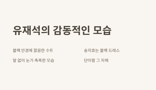 김준호 김지민 결혼식 하면 하객 분위기 이야기를 안 할 수 없어! 특히 유재석 오빠ㅠㅠ 블랙 안경에 깔끔한 수트 입고, 말 한 마디 안 했는데 눈가 촉촉한 모습이 너무 찡했어. 옆에 앉은 송지효 언니는 블랙 드레스 입고 있었는데, 단아함 그 자체. 그 두 사람만 봐도 결혼식의 분위기가 얼마나 따뜻했는지 알겠더라.