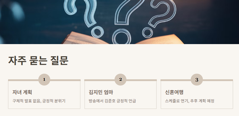 많은 팬들이 궁금해하는 게 바로 김준호 자녀에 대한 얘기랑 신혼여행 계획이었는데, 아직은 구체적인 얘기 없었어! 그리고 신혼여행은 둘 다 스케줄이 바빠서 당분간은 연기한다고 하더라.