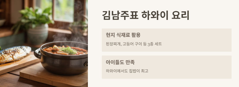 방송 보면서 제일 궁금했던 건 김남주 언니가 만든 요리였는데, 하와이에서 직접 요리해 먹었던 3종 세트를 보여주더라. 와, 진짜 주부력 미쳤다ㅋㅋ 현지 식재료 활용해서 된장찌개에 고등어 구이까지 했는데 그걸 또 아이들이 잘 먹었대. 하와이에서도 집밥이 최고라는 걸 보여준 장면이었어.
