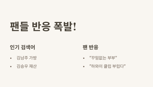 이 썰 풀자마자 SNS랑 커뮤 다 뒤집혔더라. 특히 “김남주 김승우 하와이”라는 키워드로 검색해보면, 연관 검색어로 김남주 가방, 김승우 재산까지 줄줄이 나오는 거 실화냐? 팬들 사이에선 “진짜 꾸밈 없는 부부다” vs “하와이에서 클럽이라니 부럽다” 반응 갈리는데, 나는 그냥 귀엽고 멋있어 보였음!