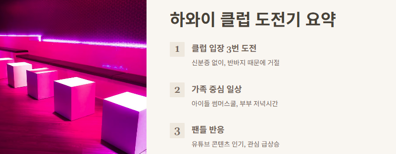 김남주와 김승우 부부가 하와이에서 겪은 유쾌한 클럽 입장 도전기가 팬들 사이에서 화제를 모으고 있어요. 세 번의 도전 끝에 결국 입장에 성공한 에피소드와 더불어 하와이 라이프의 현실적인 뒷이야기까지 공개돼 많은 공감을 얻고 있답니다.