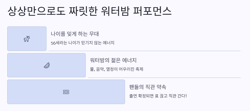 나도 친구들이랑 노래방에서 부르면 무조건 춤추고 난리남 ㅋㅋㅋ 이게 바로 ‘김완선 워터밤 무대’가 필요한 이유야.