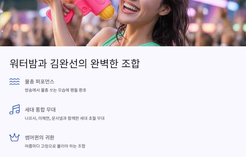 나 요즘 워터밤 페스티벌 진짜 가고 싶었는데, 거기에 김완선 언니까지 나오면 진짜 인생 여름템 확정이잖아.