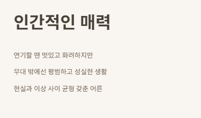 제가 좋아하는 관점이에요. 연기할 땐 멋있고 화려하지만, 다시 무대 밖으로 나오면 이처럼 평범하고 성실한 생활을 영위하는 배우. 그 모습이 더 인간적으로 보이더라고요. 현실과 이상 사이 균형을 갖춘 어른 같은 인상, 그런 성숙함이 있어서 앞으로 작품에서 더욱 기대되어요.
