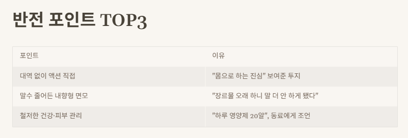 포인트 | 이유 대역 없이 액션 직접 | “몸으로 하는 진심” 보여준 투지 말수 줄어든 내향형 면모 | “장르물 오래 하니 말 더 안 하게 됐다” 철저한 건강·피부 관리 | “하루 영양제 20알”, 동료에게 조언