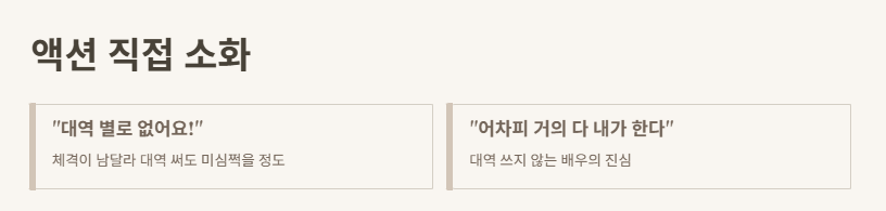 그는 키·체격이 워낙 독특해서, 대역을 쓰면 그 티가 확 난다며 거의 직접 액션을 한다고 밝혔습니다.