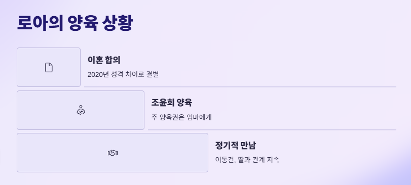 로아는 2017년생으로 현재 초등학교에 입학한 시기다. 이동건은 그녀와 “초등학생이 되면 아빠 집에서 자기”로 약속했다며, 이 약속을 지키기 위해 부동산을 함께 돌아다니며 적합한 공간을 찾는 모습이 방송됐다.