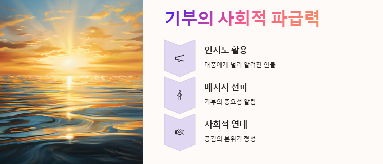 연예인의 기부는 일반 시민의 기부보다도 사회적으로 더욱 큰 파급력을 가집니다. 이동욱처럼 대중에게 널리 알려진 인물이 기부에 나서면, 더 많은 이들에게 기부의 중요성과 공감의 메시지를 전할 수 있습니다. 이러한 파급 효과는 사회 전체의 연대와 공감의 분위기를 형성하는 데 중요한 역할을 합니다.