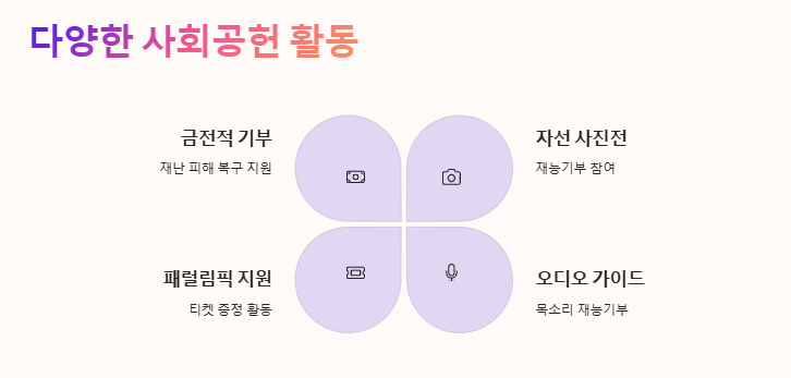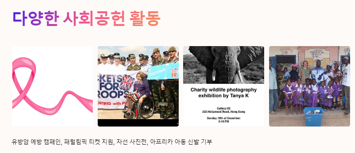 유방암 예방 캠페인, 패럴림픽 티켓 지원, 자선 사진전 참여 등 다양한 활동을 해왔습니다.