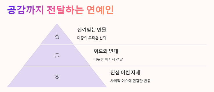이동욱의 선한 영향력은 단순히 금액으로 환산될 수 없습니다. 그는 사회적 이슈에 민감하게 반응하며, 따뜻한 위로와 연대의 메시지를 함께 전합니다. 대중의 신뢰를 받는 이유는 바로 이러한 ‘공감 능력’과 ‘진심 어린 자세’에 있습니다.