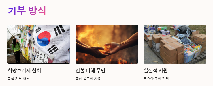 희망브리지 전국재해구호협회를 통해 공식 기부가 이루어졌으며, 기부금은 산불 피해 주민들을 위해 사용됩니다.