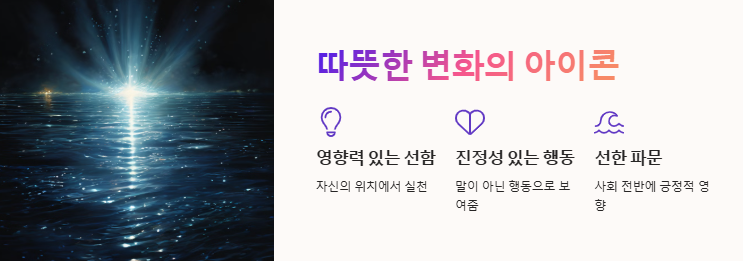 결국 선한 영향력이란 말은 말 그대로 ‘영향을 주는 선함’입니다. 이동욱은 자신의 위치에서, 자신의 방식으로 이 선함을 대중에게 실천해 보이고 있습니다. 진정성 있는 행동은 결국 팬들뿐만 아니라 사회 전반에 선한 파문을 일으키는 법입니다.