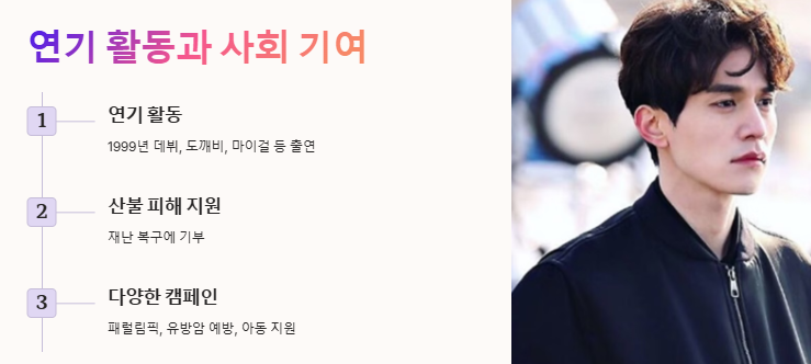 이동욱은 1999년 드라마 데뷔 이후 꾸준히 다양한 역할을 소화하며 연기력으로 대중의 사랑을 받아왔습니다. 특히 《도깨비》, 《마이걸》, 《뷰티 인사이드》 등의 작품에서는 감정의 섬세한 표현으로 극의 몰입도를 높였습니다. 이와 함께 그는 다양한 기부 활동을 통해 사회적 책임을 실천해왔습니다. 산불 피해 지원은 물론, 평창 동계 패럴림픽, 유방암 예방 캠페인, 아프리카 아동을 위한 신발 기부 등 다양한 영역에서 선한 영향력을 펼쳐왔습니다.