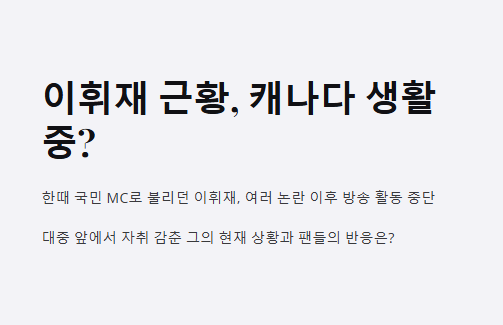 한 언론 보도에 따르면, 이휘재는 캐나다 밴쿠버에서 가족과 함께 조용히 지내고 있는 것으로 알려졌습니다. 특히 자녀 교육에 집중하고 있으며, 현재는 연예계 복귀보다 가정 중심의 삶을 선택한 것으로 보입니다. “이휘재 근황”에 대한 실마리는 이 캐나다 생활이 중심 축이 되고 있습니다.