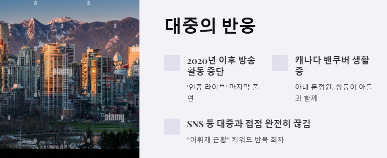 한 언론 보도에 따르면, 이휘재는 캐나다 밴쿠버에서 가족과 함께 조용히 지내고 있는 것으로 알려졌습니다. 특히 자녀 교육에 집중하고 있으며, 현재는 연예계 복귀보다 가정 중심의 삶을 선택한 것으로 보입니다. “이휘재 근황”에 대한 실마리는 이 캐나다 생활이 중심 축이 되고 있습니다.