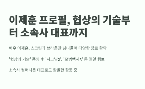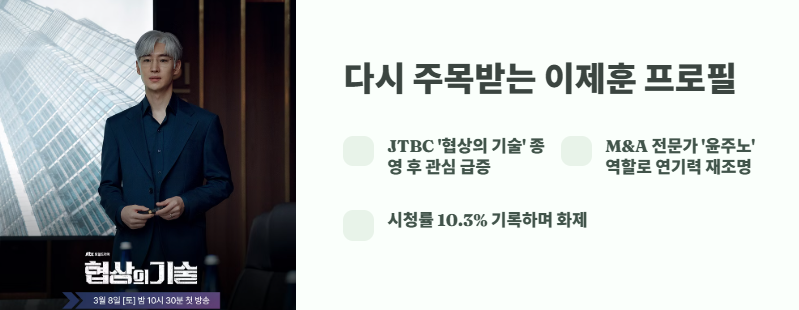 ‘이제훈 프로필’에 대한 관심은 최근 종영한 JTBC 드라마 '협상의 기술' 이후 더욱 커지고 있으며, 이 작품에서 M&A 전문가 ‘윤주노’로 변신한 그의 연기력이 재조명되고 있다.
