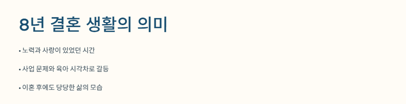 솔직히 8년 결혼 생활이라는 게 하루아침에 무너졌겠어? 분명 노력도 많았고, 사랑도 있었을 거야. 근데 서로 너무 달랐던 것 같아. 특히 사업 문제로 인한 스트레스, 육아에 대한 시각 차이 이런 게 쌓이다 보면 어쩔 수 없지.