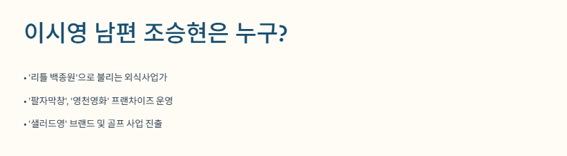 사실 이시영 언니가 2017년에 결혼한 거, 나중에야 알았었는데 남편분이 그냥 일반인 아님! 완전 잘나가는 외식사업가 조승현 대표님이셔. ‘리틀 백종원’이라고 불릴 정도로, ‘팔자막창’, ‘영천영화’ 같은 프랜차이즈 브랜드를 성공시킨 인물이야.