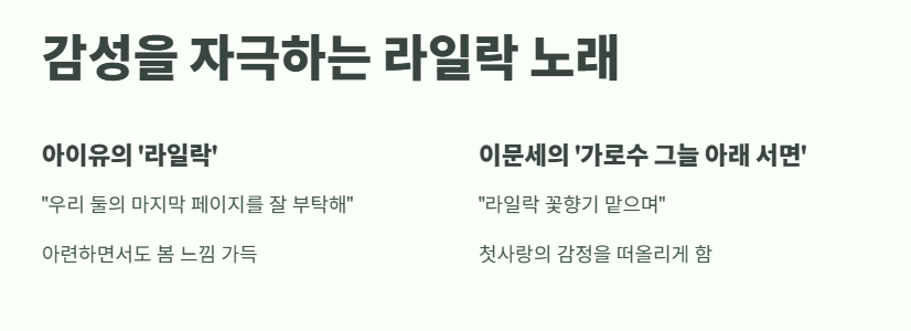 개인적으로 라일락 하면 제일 먼저 떠오르는 노래는 아이유의 <라일락>이에요. "우리 둘의 마지막 페이지를 잘 부탁해"라는 가사가 참 아련하면서도 봄 느낌 가득하죠. 봄날 창문 열어놓고 들으면 마음이 몽글몽글해져요.