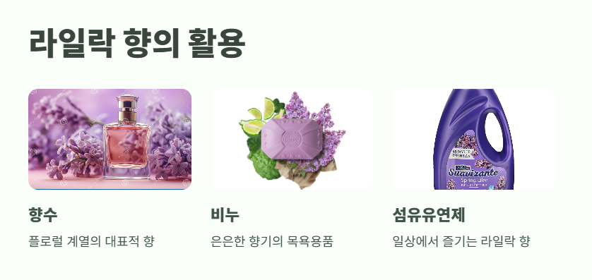 라일락 향은 향수, 비누, 섬유유연제 등에서 플로럴 계열로 자주 사용됩니다.
