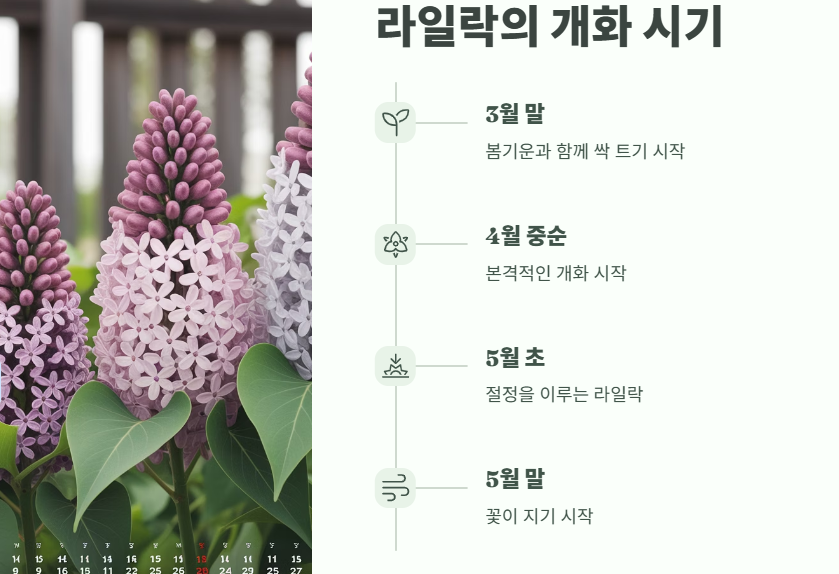라일락은 4~5월 사이, 봄철에 개화합니다. 지역에 따라 시기가 조금씩 다를 수 있습니다.