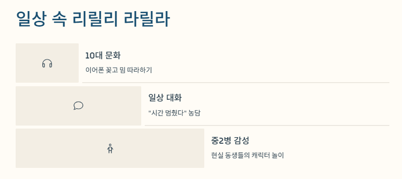 리릴리 라릴라 능력은 진짜 중2병 감성도 좀 있는 것 같고, 현실 동생 캐릭터에 너무 찰떡이야. 요즘은 걔가 “퉁퉁퉁 싸우르” 외치는 거랑 섞어서 혼자 밈 세계관 만든다?ㅋㅋ