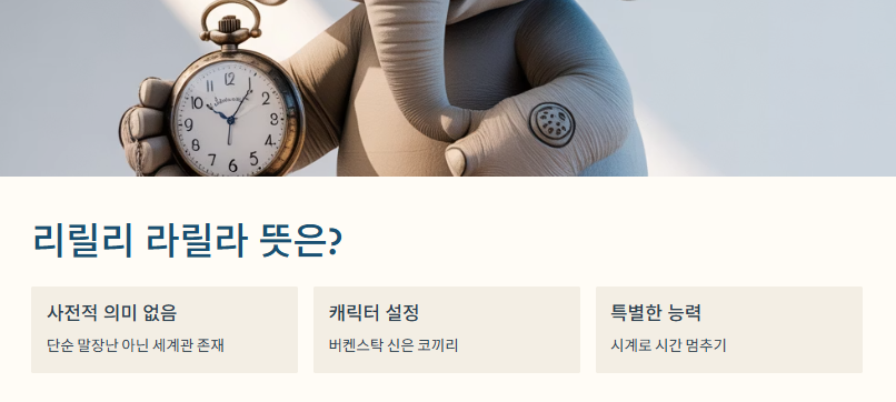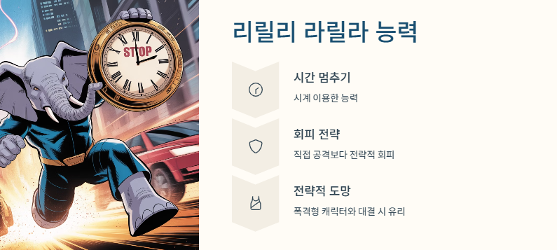 리릴리 라릴라는 버켄스탁 샌들을 신고 다니는 코끼리 캐릭터인데, 시계를 이용해서 시간을 멈출 수 있는 능력이 있어. 그래서 싸우는 걸 잘 안 하고 주로 회피형 전략으로 움직인다는 설정이야.