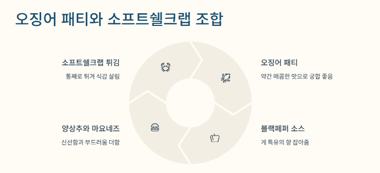 버거 안에는 소프트쉘크랩 튀김, 오징어 패티, 블랙페퍼 소스, 양상추랑 마요네즈가 들어가 있더라고요. 한 입 먹으니까 블랙페퍼 향이 확 퍼지는데, 이게 또 게 특유의 향을 눌러주는 역할을 해줘요. 그래서 비린맛이 그렇게까지 심하지 않았어요. 오히려 오징어 패티가 약간 매콤해서 궁합 잘 맞음!