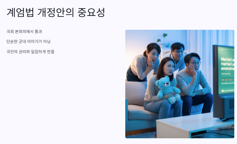 안녕? 오늘은 내가 최근에 본 뉴스 중에서 진짜 흥미로웠던 거 하나 소개할게! 바로 ‘계엄법 개정안’이야. 처음에는 나도 솔직히 “계엄? 우리랑 뭔 상관이지?” 했는데, 뉴스 읽다 보니까 완전 깜짝 놀랐어. 이번에 계엄법 개정안이 국회 본회의에서 통과됐거든? 이게 단순히 군대 이야기 아니고, 우리 ‘국민의 권리’랑도 진짜 밀접하게 연결돼 있어서 꼭 알아야겠더라고.