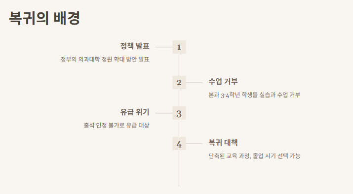 의대생들의 복귀는 그렇게 오래된 이야기가 아니야. 작년 말, 정부가 의과대학 정원 확대 방안을 발표하면서 많은 본과 3·4학년 학생들이 수업과 실습을 거부했고, 이로 인해 유급 위기를 맞게 되었어. 학교는 출석을 인정할 수 없었기 때문에 규정상 유급 처리될 상황이었지만, 정부와 대학들은 이들을 다시 받아들이기 위한 방안을 마련했지.