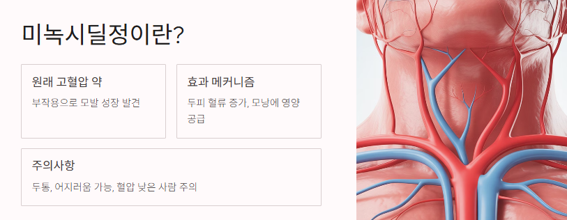 → 두피 혈류를 증가시켜서 모낭에 산소랑 영양이 잘 가게 해주고, 쉐딩현상 이후에 새로운 머리가 자람. - 복용 시 주의사항은 뭐야?