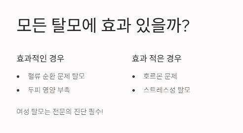 → 외용제 반응이 없을 때 정제가 대안이 될 수 있어요. 두피 상태에 따라 달라요.