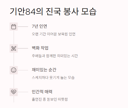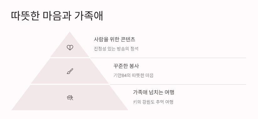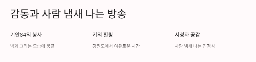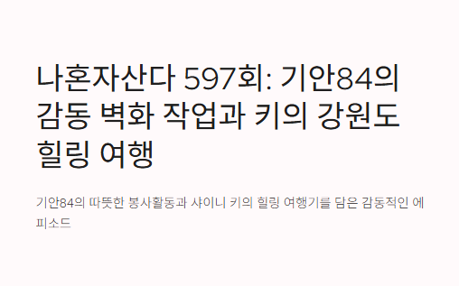 이번에 기안84랑 샤이니 키가 출연해서 벽화 봉사부터 강원도 힐링까지 보여줬는데, 너무 사람 냄새 나는 방송이었어. 사실 나도 친구랑 같이 봉사활동 가본 적 있어서 기안84가 보육원에서 벽화 그리는 장면 보고 뭉클했어.