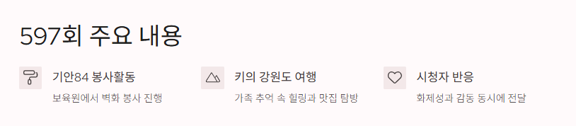 나혼자산다 597회는 진짜 사람을 위한 콘텐츠의 정석이랄까? 기안84의 꾸준한 봉사 모습과 키의 가족애 넘치는 강원도 여행기가 너무 잘 어울렸어. 사실 기안84가 아이들 위해 벽화 그리는데 바나나랑 블루베리 그림으로 마무리하는 모습, 애들 반응까지 너무 따뜻해서 웃음과 감동 동시에 터졌어.