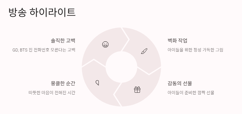 내가 본 나혼자산다 597회 하이라이트 중 하나는 기안84가 GD랑 BTS 진 얘기하면서 "전화번호도 몰라"라고 솔직하게 말하는 장면! 그리고 벽화 작업 끝나고 아이들이 선물 주는 장면은 진짜 뭉클 그 자체였어.