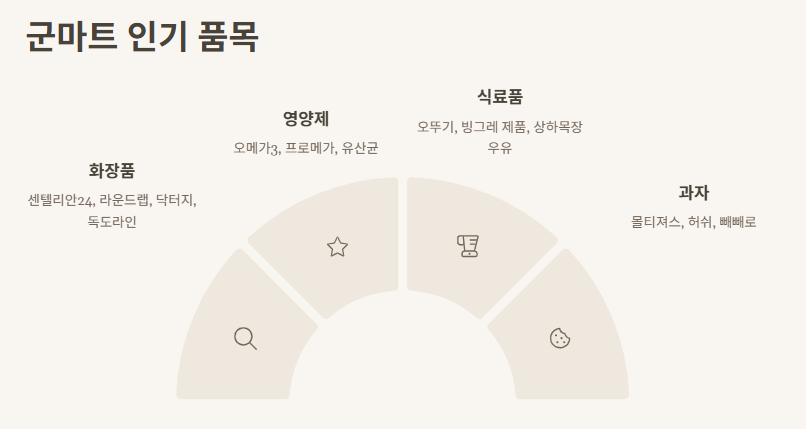 - 식료품: 오뚜기, 빙그레 제품, 상하목장 우유