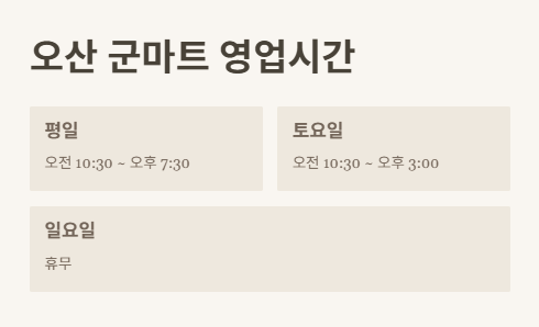 TIP. 오산 군마트 영업시간은 평일 중심 운영이에요.