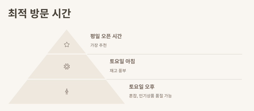 저는 토요일 낮에 갔는데요. 와... 진짜 사람 많아서 깜짝 놀랐어요. 주차는 그나마 괜찮았지만, 인기 상품들은 이미 동나있더라고요. 유제품, 음료, 냉동식품 코너는 거의 텅텅. 그래서 평일이나 오픈 시간에 가는 게 베스트!