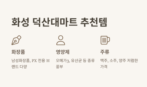 덕산대마트는 화성 봉담읍에 있는 국군복지단 영외마트인데요, 340㎡ 넓은 매장에 품목도 다양해요. 남성화장품, PX 전용 브랜드 화장품, 오메가3나 유산균 같은 영양제도 많고, 라면이나 과자 같은 생필품도 꽉 차 있어요.