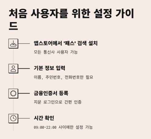 제가 처음 썼을 때, 앱스토어에서 ‘패스’ 검색해서 설치했어요. KT 알뜰폰 쓰는데도 문제없이 가입됐고요. 인증서는 금융인증서로 했고, 지문 로그인하니까 설정도 간편했어요.