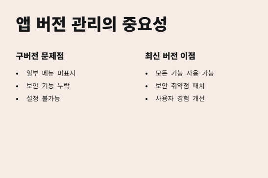 일부 메뉴가 아예 안 뜰 수 있으니까 앱을 꼭 최신으로 업데이트하세요.